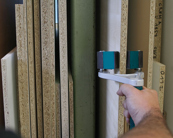 Il suo pratico ed ergonomico disegno permette il trasporto con facilità di pannelli di legno, metallo, PVC, etc.. fino a 46 mm di spessore.
